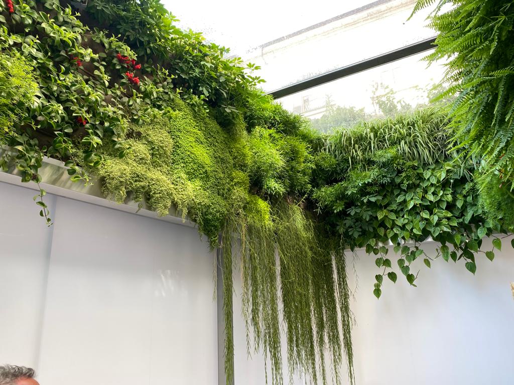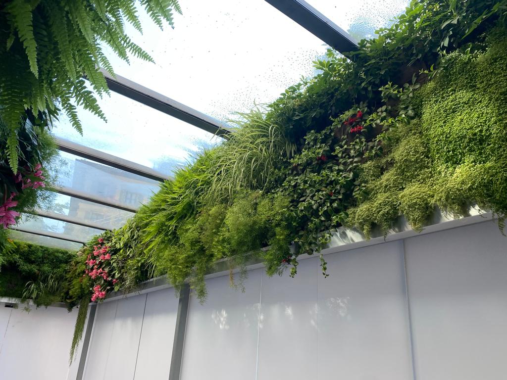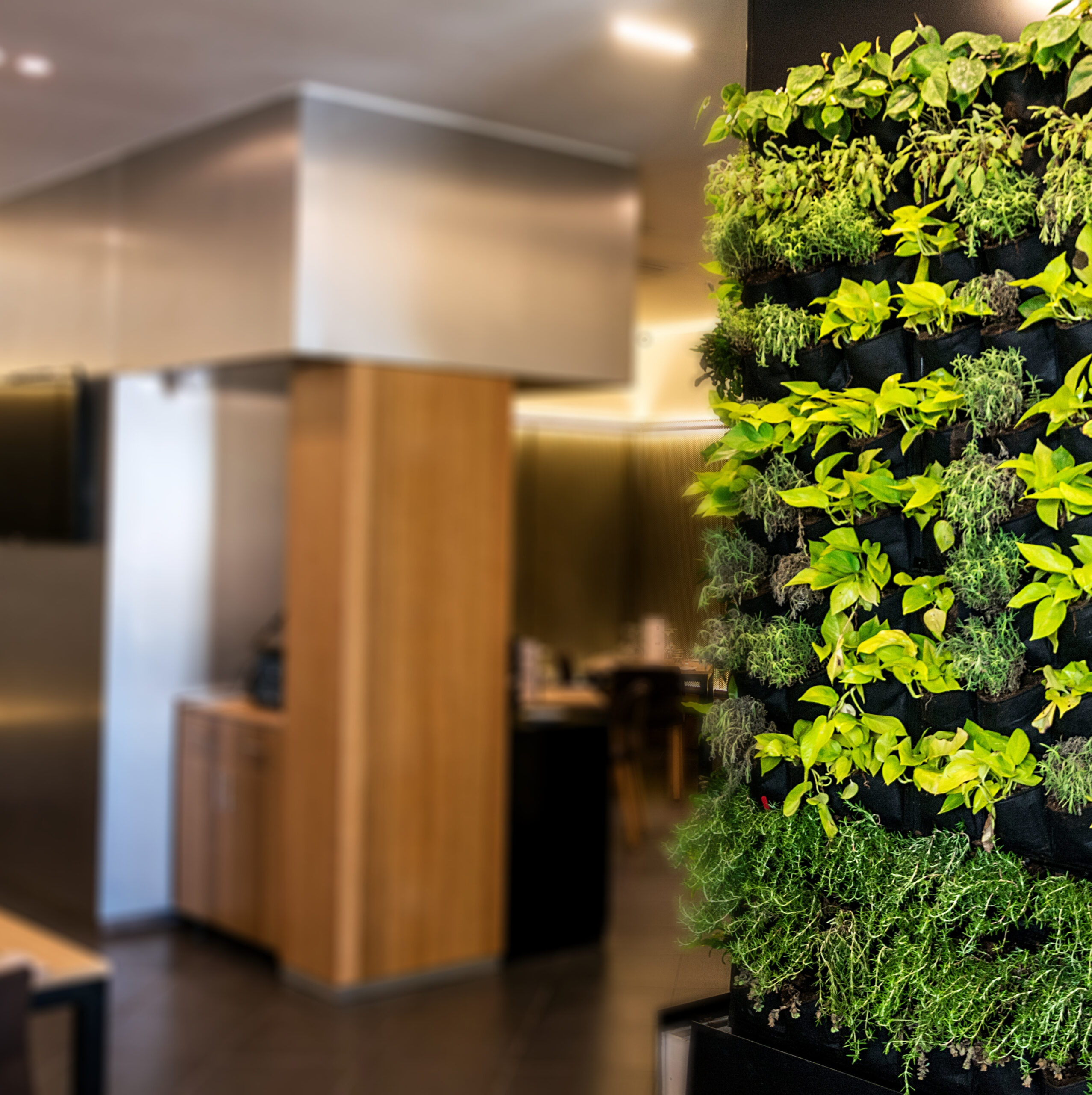 Living green wall, vertical garden indoors in modern restaurant